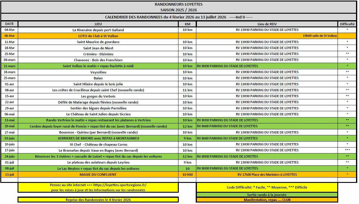 Planning des rando du 1ier semestre 2026